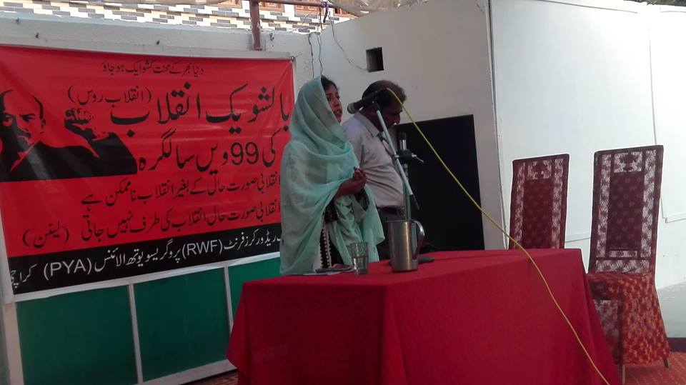 بالشویک انقلاب طبقاتی سماج کو بدلنے کی سب سے سنجیدہ کاوش ہے، واحد بلوچ جیسے سیاسی کارکنوں کی گمشدگی اور میر حاصل بلوچ جیسے نوجوانوں کا قتل عام سرمایہ دارانہ قومی ریاست کی زوال پذیری کا ثبوت ہے۔ عالمی منظرنامے میں جاری معاشی و سیاسی بحران سے نجات کا واحد راستہ پھر ایک بالشویک انقلاب ہی ہو سکتا ہے۔ ان خیالات کا اظہا ر مقررین نے ریڈورکرز فرنٹ(RWF) اور پروگریسو یوتھ الائنس(PYA) کے زیر اہتمام بالشویک انقلاب کی 99ویں سالگرہ کے موقع پر خطاب کرتے ہوئے کیا۔ پروگرام کا انعقاد 5نومبر کو پرنس گارڈن ہال بالمقابل ملیر کورٹس میں کیا گیا تھا۔ مقر رین میں ریڈ ورکرز فرنٹ، کراچی کے آرگنائزر تصور قیصرانی، پروگریسو یوتھ الائنس کراچی کے آ رگنائزر فارس راج، جنرل ٹائر ورکرز یونین کے رہنما صفدر جبار، این ایس ایف کوئٹہ کے کارکن فہیم بلوچ اور عوامی جمہوری پارٹی کراچی کے صدر رشیدسدھایونے شامل تھے۔