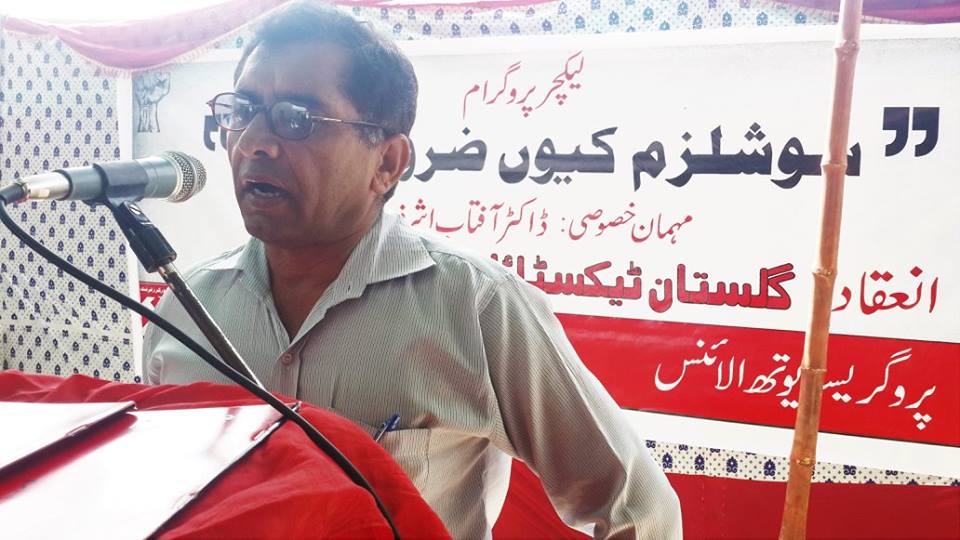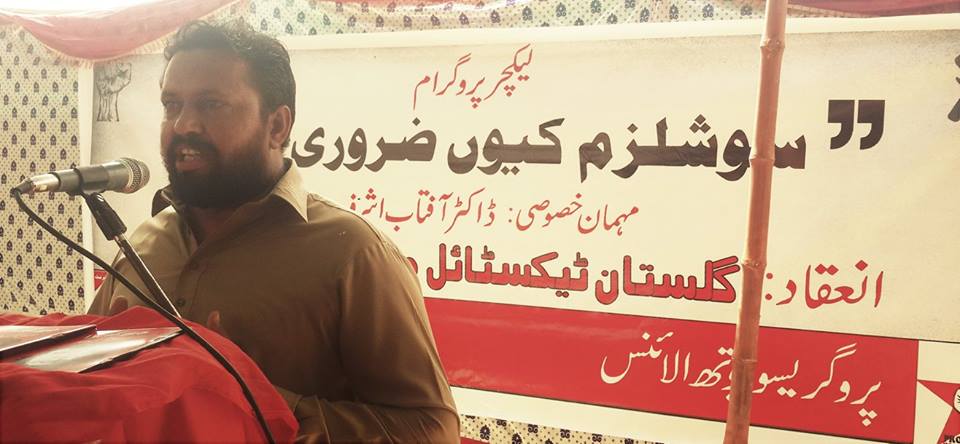 ڈاکٹر آفتاب اشرف نے تقریر کے آغاز میں گلستان ٹیکسٹائل ملزکے مزدوروں کی جراتمندانہ جدوجہد کو خراج تحسین پیش کیا اور ساتھ ہی یہ بھی یقین دہانی کرائی کہ ریڈورکرز فرنٹ اس لڑئی میں ہر مرحلے پر ان کے ساتھ ہے۔ اس کے بعد ڈاکٹر فتاب اشرف نے موضوع پر بات کا آغاز کیا اور سوشلزم کے متعلق بتاتے ہوئے کہا کہ سوشلزم ایک ایسا نظام ہے جس میں تمام بڑی بڑی فیکٹریاں، زمینیں، وسائل یعنی وہ تمام ذرائع جن سے پیداوار کی جا سکے یا نئی چیزیں بنائی جا سکیں وہ پورے سماج کی اجتماعی ملکیت میں ہوں گے۔ سرمایہ دارانہ نظام میں وہ تمام ذرائع جن سے پیداوار کی جاتی ہے چند لوگوں کی ملکیت ہیں جس کی وجہ سے وہ تمام دولت جو پیدا ہوتی ہے ان چند لوگوں کے پاس ہی چلی جاتی ہے اور وہ تمام محنت کش جو اس دولت کو پیداکرتے ہیں، دن رات محنت کر کے ان کو بس اتنا ہی مل پاتا ہے جس سے وہ زندہ رہ سکیں اور ان چند لوگوں کی خدمت کر سکیں جو ان ذرائع پیداوار کے مالک ہیں۔ یہ سلسلہ نسل در نسل چلتا رہا ہے اور محنت کشوں کی نسلیں حکمرانوں کی نسلوں کی غلام رہی ہیں۔ اب وقت آگیا ہے کہ ہم یہ سمجھ جائیں کہ ہمیں ان حکمرانوں کی غلامی کرنے اور ہمارے بچوں کو ان حکمرانوں کے بچوں کی غلامی کرنے کیلئے پیدا نہیں کیا گیا۔ اور اگر ہم سب مل کر اس سماج کی تعمیر کریں تو یہ دنیا جو آج چند لوگوں کیلئے جنت ہے اسے ہم سب کیلئے جنت بنا سکتے ہیں۔ ڈاکٹر آفتاب اشرف کی ان باتوں کو سننے کے بعد تمام مزدور وں نے بلند آواز میں سوشلزم زندہ باد کے نعرے لگائے۔