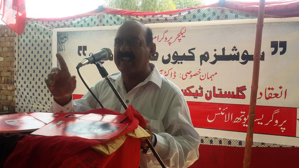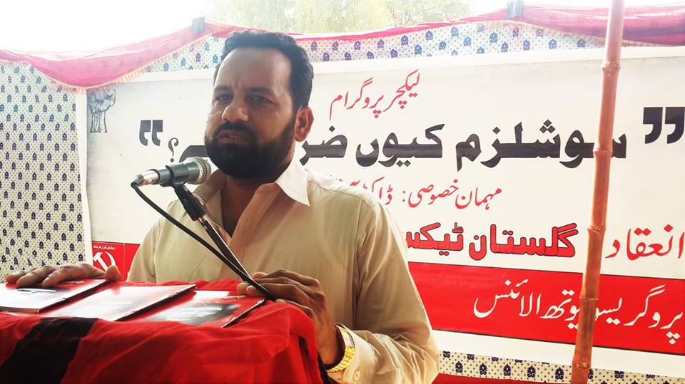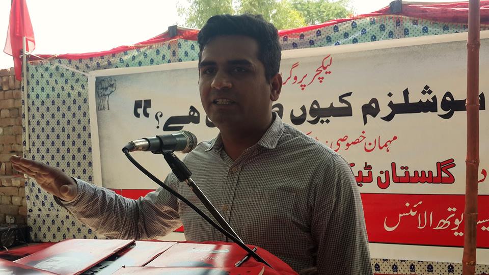 پروگرام کے افتتاحی کلمات ادا کرتے ہوئے ریڈ ورکرز فرنٹ بہاولپور کے انچارج اور گلستان ورکرز یونین کے صدر رفیق چنڑ نے تمام حاضرین کو خوش آمدید کہا اور سب سے پہلے تمام شرکا کو گلستان ٹیکسٹائل ملز کے مزدوروں کے ساتھ ہونے والے ظلم و استحصال اور مشکل حالات سے آگاہ کیااور بتایا کہ کس طرح ایک سال گزر جانے کے بعد بھی گلستان ٹیکسٹائل ملز کے مزدوروں کو ان کی تنخواہیں ادا نہیں کی گئیں جو مل مالک پر واجب الادا ہیں۔ اور کس طرح وہ سات سات ماہ کی تنخواہ لئے بغیر کام کرتے رہے اور ادھار مانگ کر روز کا گزر بسر کرتے رہے۔کس طرح ان کی عیدیں بغیر نئے کپڑوں کے اور خوشیوں کے گزرتی رہیں اور کس طرح وہ عیدوں کے دوران اپنے بچوں کے چہروں پر چھائی اداسی اور احساس کمتری کو برداشت کرتے رہے۔ مگر انھوں نے یہ لڑائی ختم نہیں کی اور تب تک جاری رکھیں گے جب تک ان کو ان کے بقایا جات نہیں مل جاتے۔ اس کے بعد ریڈ ورکرز فرنٹ اور گلستان ورکرز یونین کے رکن ساجد چنڑ نے حاضرین سے خطاب کرتے ہوئے گلستان ٹیکسٹائل ملز کے مزدوروں کو ان کی مسلسل جدوجہد پر خراج تحسین پیش کیا اور یہ کہا کہ جس طرح وہ اس لڑائی میں ساتھ ساتھ کھڑے رہے ہیں اسی طرح دیگر اداروں کے مزدوروں ساتھ طبقاتی جڑت بناتے ہوئے ہم اس سرمایہ دارانہ نظام کو بھی جڑ سے اکھاڑ سکتے ہیں جو نا انصافی کی بنیادی وجہ ہے۔ اور اس نظام کو اکھاڑنے کے بعدایک نیا نظام قائم کر سکتے ہیں جس کا نام سوشلزم ہے۔ ساجد چنڑ کے بعد گلستان ٹیکسٹائل ملز کے ورکر آصف جاہ نے بات کرتے ہوئے سرمایہ دارانہ نظام کو تنقید کا نشانہ بنایااور ایک نئے سماجی نظام کی ضرورت اور اہمیت پر زور دیا اور یہ کہا کہ سوشلزم ایک انسان دوست نظام ہے اور انسانیت کیلئے ہے جس میں انسانوں کی قدر ہوتی ہے پیسوں کی نہیں اور سرمایہ دارانہ نظام کو شکست دینے کے لئے ہمیں اپنی جدوجہد کو مستقل آگے بڑھانے کی ضرورت ہے۔ان افتتاحی تقاریر کے بعد اور لیکچر شروع ہونے سے پہلے سرائیکی زبان کے انقلابی شاعر غیور بخاری نے انقلابی شاعری پیش کی اور مزدوروں میں انقلابی فکر کو جگایااور روشن مستقبل کی جھلک دکھلائی جو ان کی جدوجہد کا طالب ہے۔