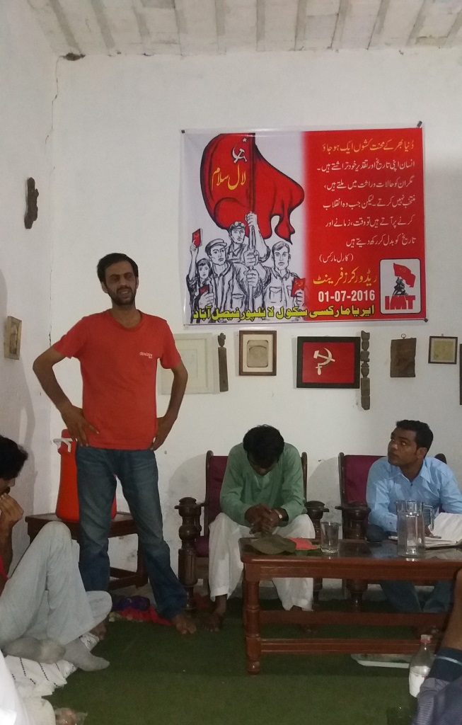 مورخہ یکم جولائی 2016ء بروز جمعہ فیصل آباد میں ریڈ ورکرز فرنٹ(RWF) کے زیر اہتمام ایک روزہ مارکسی سکول کا انعقاد کیا گیا۔سکول مجموعی طور پر دو سیشنز پر مشتمل تھا۔ پہلا سیشن کا موضوع عالمی تناظر تھا جس پر لیڈ آف مجاہد نے دی ۔ لیڈ آف میں مجاہد نے عالمی صورتحال پر تفصیلی بات رکھی جس میں بالخصوص Brexitکے بعد یورپ کی تیزی سے بدلتی ہوئی صورتحال کے علاوہ مشرق وسطٰی، جنوبی افریقہ، لاطینی امریکہ سمیت ایشیا میں ابھرتی ہوئی تحریکوں پر روشنی ڈالی۔ لیڈ آف کے بعدشرکاء کی طرف سے سوالات پوچھے گئے ۔اس کے بعد نجف، تاشفین، زین، راشد خالد نے بحث کو آگے بڑھاتے ہوئے کہا کہ۔ کامریڈز نے ہم ایسے عہد میں داخل ہو چکے ہیں جس میں تیز ترین تبدیلیاں رونما ہو رہی ہیں۔ یورپی یونین ٹوٹنے کی طرف جارہا ہے۔ یورپ کے اند ر اس وقت شدید سیاسی اور معاشی بحران پایا جا رہا ہے۔ سپین، فرانس، اٹلی، یونان، آئرلینڈ،برطانیہ اور سکاٹ لینڈ میں مختلف تحریکیں چل رہی ہیں جو کہ سرمایہ داری کے بڑھتے ہوئے اور گہرے ہوتے ہوئے بحران کا نتیجہ ہے۔ اس کے علاوہ امریکہ میں ہونے والے صدارتی الیکشن پر تفصیلاً بات کی گئی جس میں برنی سینڈر اور ڈونلڈ ٹرمپ کے ابھار کو زیر بحث لایا گیا۔ تاشفین نے اپنے بنائے ہوئے کارٹونز اور پینٹنگز سے عوام کو درپیش مسائل کو سامنے لے کر آئے۔ اس کے بعد مجاہد نے سوالوں کے جواب دیتے ہوئے بحث کو سمیٹا اور پہلا سیشن اختتام کو پہنچا۔
