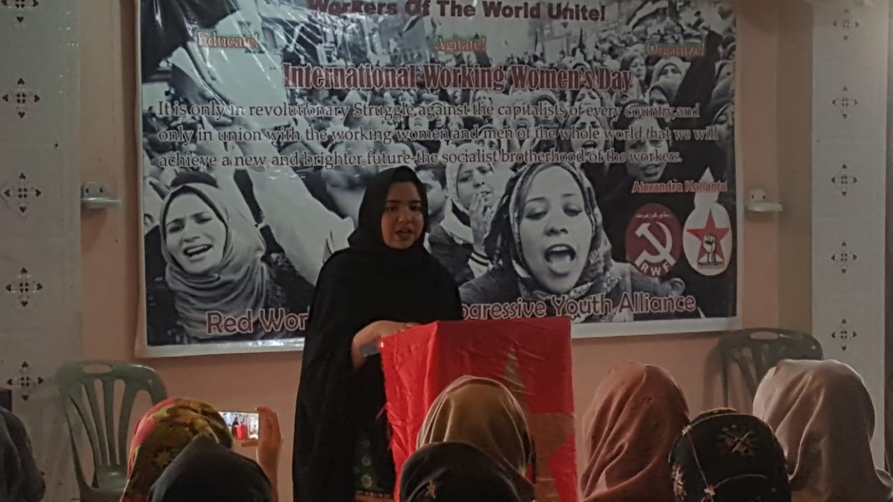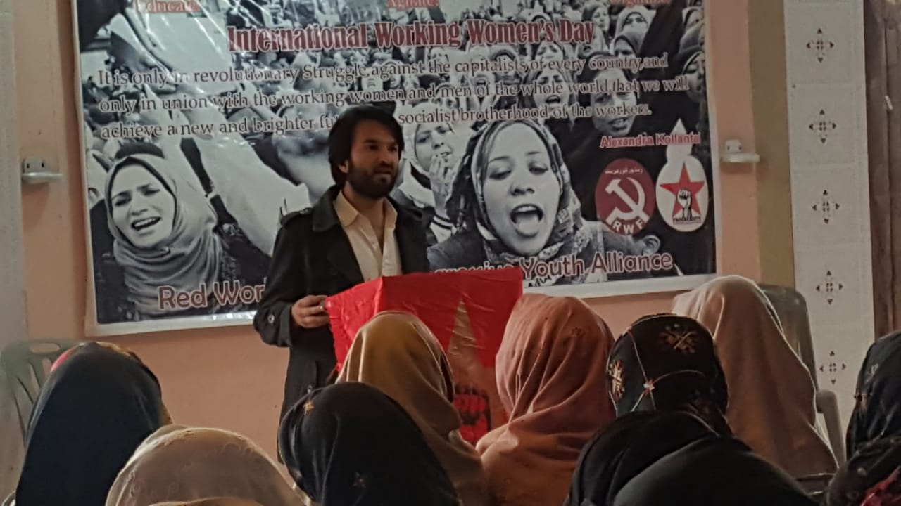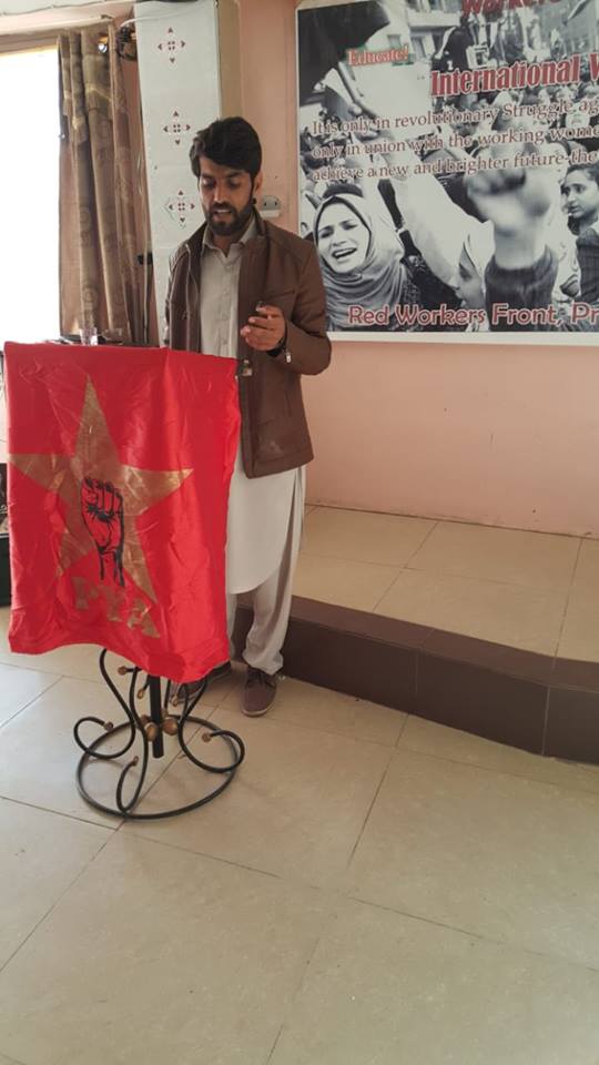 ریڈ ورکرز فرنٹ کے صوبائی آرگنائزر کریم پرھر نے اپنے خطاب میں تاریخی طور پر تحریکوں میں خواتین کے کردار پر روشنی ڈالی اور بالخصوص مشرق وسطیٰ میں کرد خواتین کے کردار کو سراہا اور ان کو خراج تحسین پیش کیا۔ اس کے علاوہ انہوں نے محنت کش خواتین کو درپیش بے انتہا مسائل جن میں اجرتیں، تعلیم، صحت اور دیگر بنیادی ضروریات کے حوالے سے اعدادوشمار کے ساتھ اجاگر کیا اور کہا کہ سرمایہ داری میں ہر نیا دن محنت کش خواتین کے لیے ایک نیا عذاب لے کر آتا ہے۔