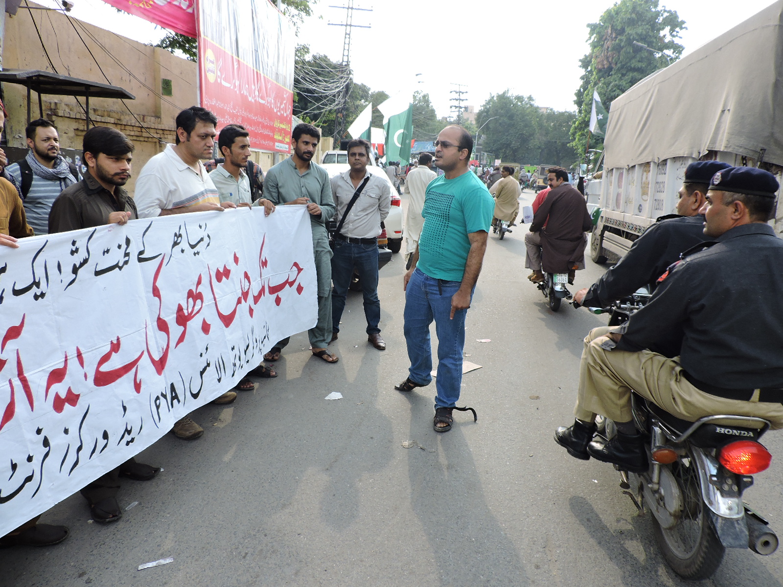 مظاہرے سے علی اوسط اور عدیل زیدی نے خطاب کرتے ہوئے کہا کہ حکمران طبقہ نے ہمارے اوپر آزادی کے جس جشن کو تھونپا ہوا ہے ہم اس آزادی کو آزادی نہیں مانتے۔ ایسی آزادی جس میں آبادی کی وسیع تر اکثریت بھوک، بیماری، جہالت، بے روزگاری، دہشت گردی اور ظلم کا شکار ہو غلامی سے بھی بدتر ہے۔ یہ آزادی صرف مٹھی بھر لٹیروں اور جاگیرداروں کی آزادی ہے تاکہ وہ اپنی لوٹ مار کو جاری رکھ سکیں اور محنت کشوں کا استحصال کر کے دولت اکٹھی کرتے رہیں۔ حقیقی آزادی تب ہی ممکن ہے جب انسان اور انسانیت سرمائے کی غلامی سے آزادی حاصل کر لے اور تمام لوگوں کو زندگی بسر کرنے کے لئے تمام آسائشیں میسر ہو۔ اور یہ صرف اسی صورت میں ممکن ہے جب ایک سوشلسٹ انقلاب کے ذریعے اس سماج کو بدلتے ہوئے جنوبی ایشیا کی رضاکارانہ سوشلسٹ فیڈریشن قائم کی جائے ۔یہ احتجاج آدھا گھنٹہ جاری رہا ۔ اس ظلم اور استحصال کے خلاف جدوجہد جاری رکھنے کا عزم کرتے ہوئے تمام مظاہرین پر امن طور پر منتشر ہو گئے۔