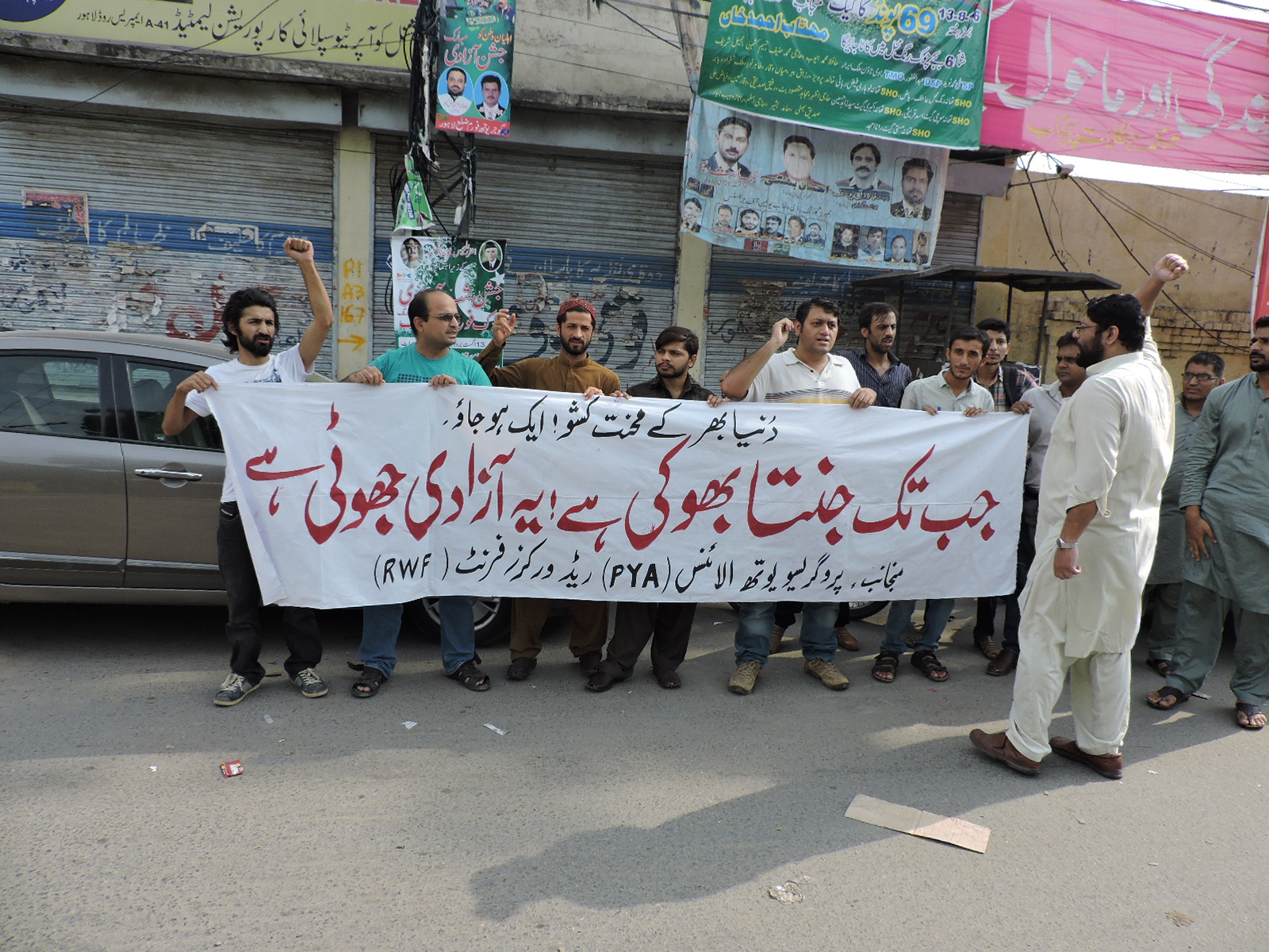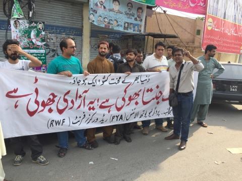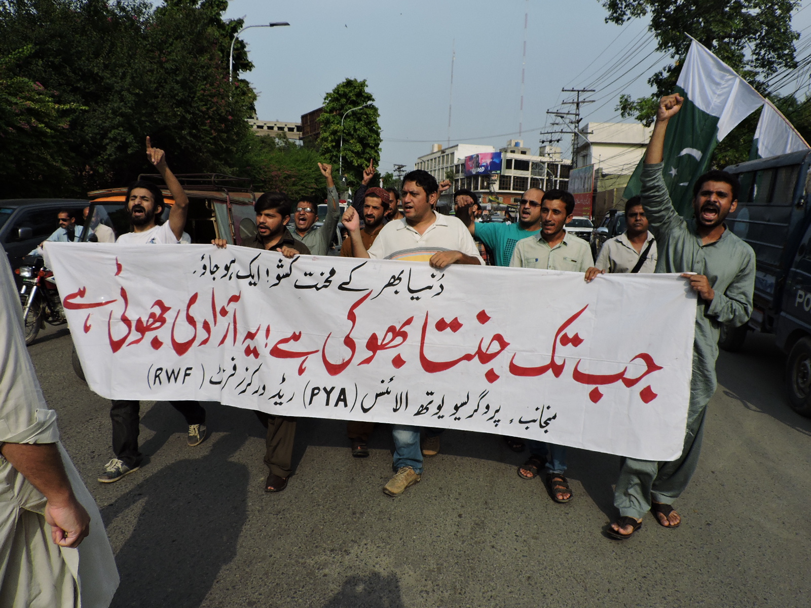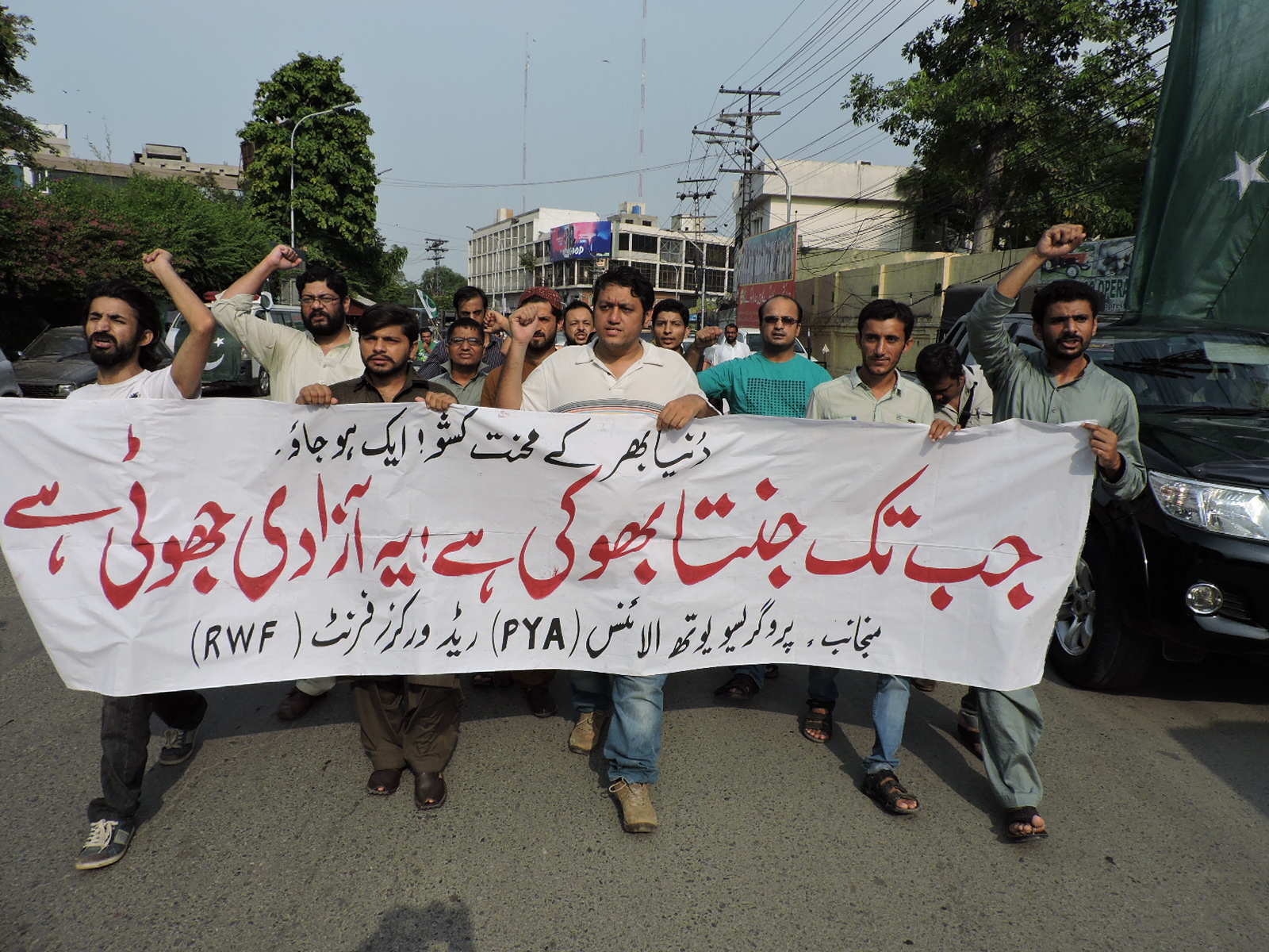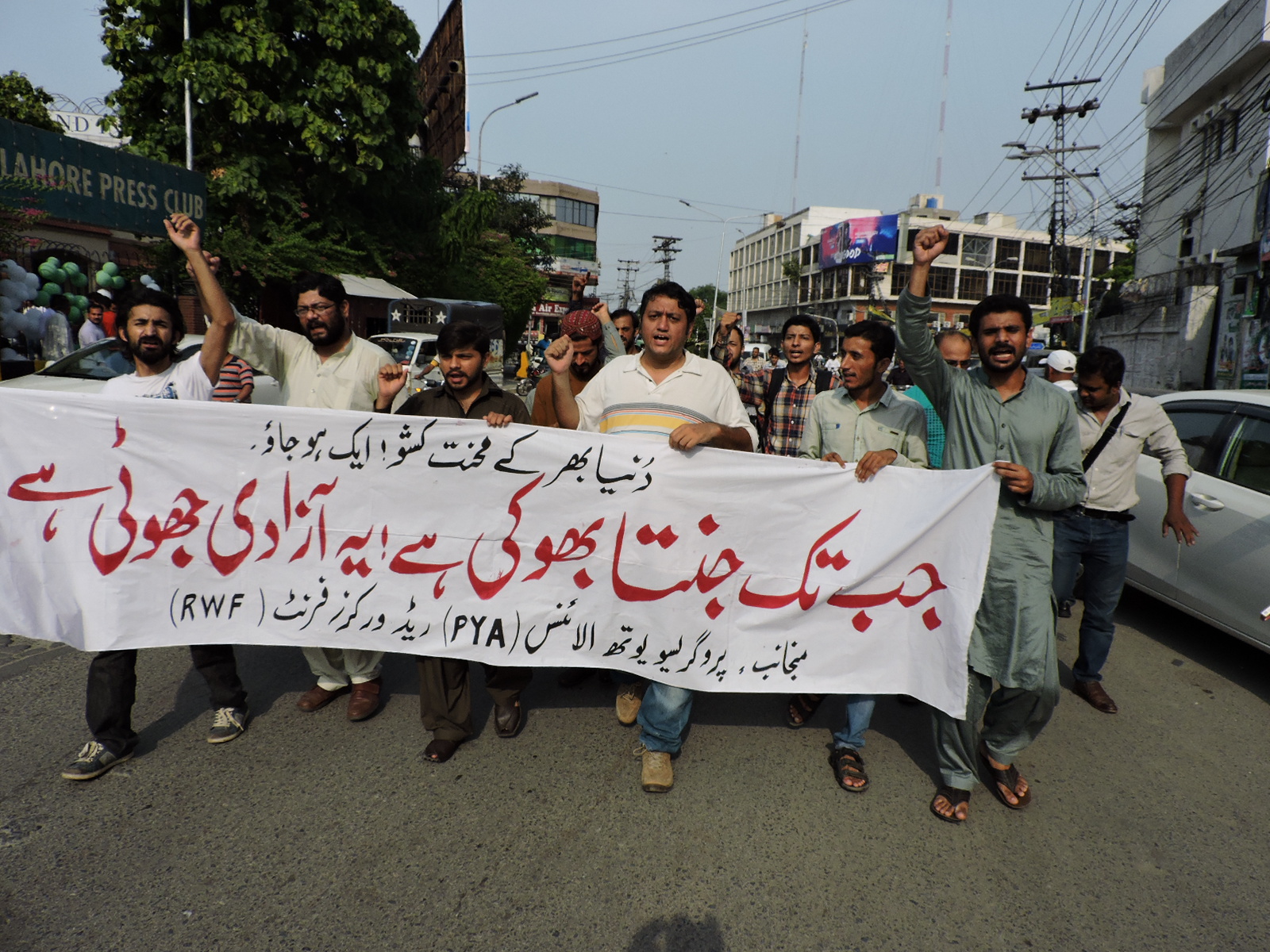 پروگریسو یوتھ الائنس(PYA) اور ریڈ ورکرز فرنٹ(RWF) کے زیر اہتمام 14اگست کو لاہور پریس کلب کے سامنے نام نہاد آزادی کے خلاف احتجاجی مظاہرہ منعقد کیا گیا۔ مظاہرین’’جب تک جنتا بھوکی ہے، یہ آزادی جھوٹی ہے‘‘ کے نعرے بلند کرتے رہے۔