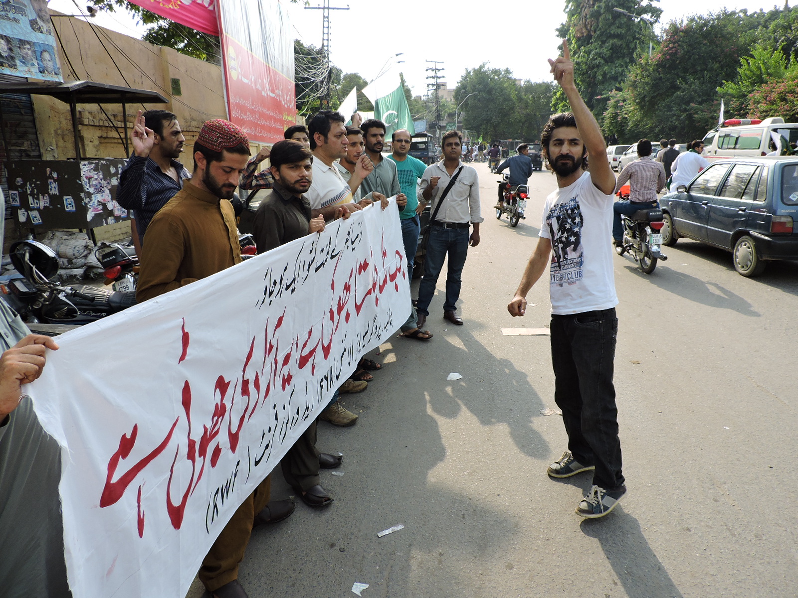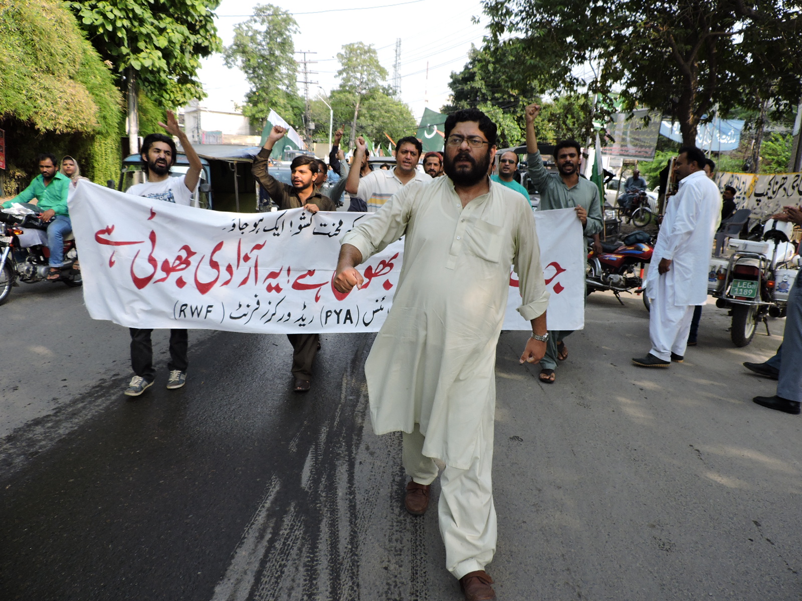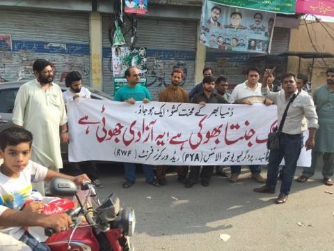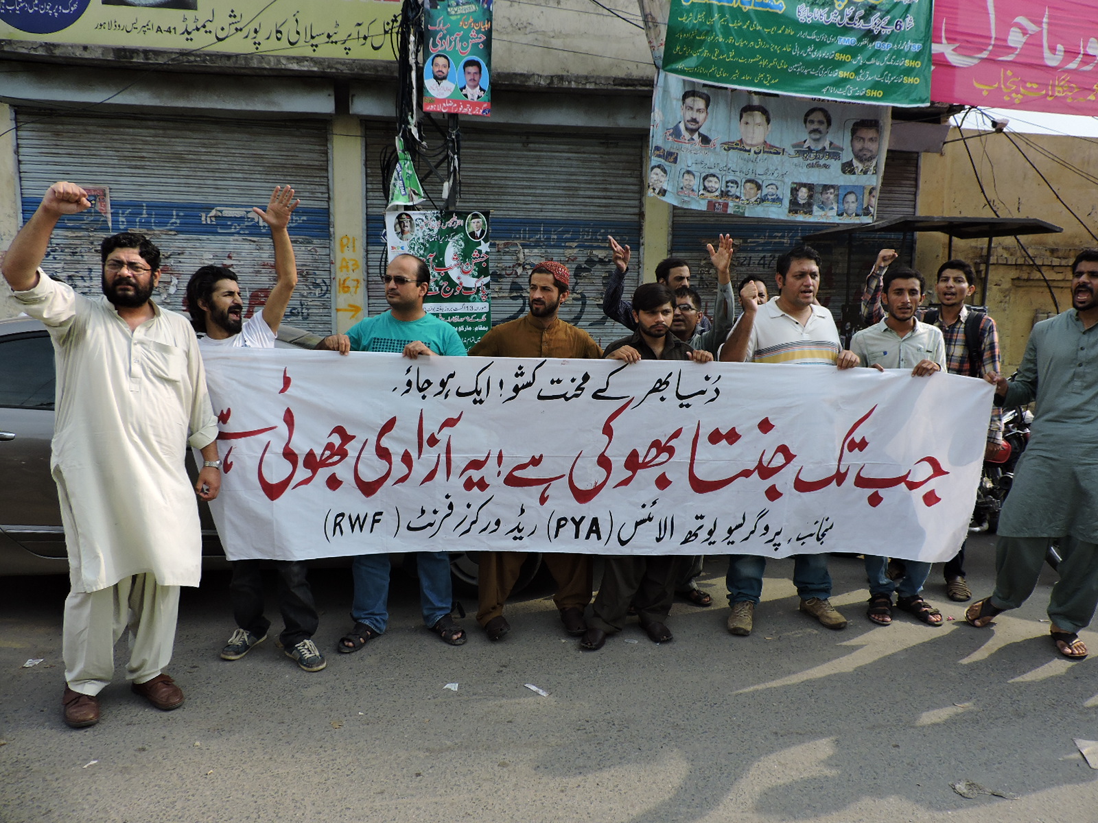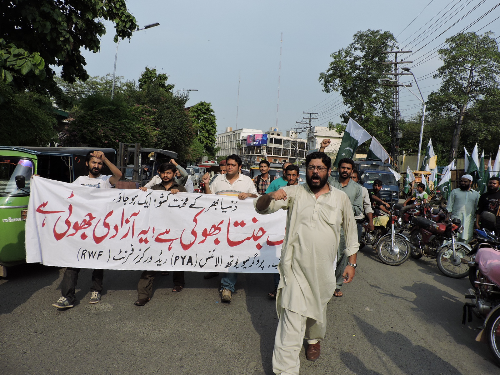 پروگریسو یوتھ الائنس(PYA) اور ریڈ ورکرز فرنٹ(RWF) کے زیر اہتمام 14اگست کو لاہور پریس کلب کے سامنے نام نہاد آزادی کے خلاف احتجاجی مظاہرہ منعقد کیا گیا۔ مظاہرین’’جب تک جنتا بھوکی ہے، یہ آزادی جھوٹی ہے‘‘ کے نعرے بلند کرتے رہے۔