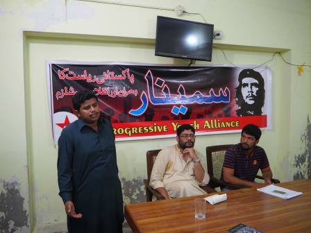 29 اکتوبر بروز ہفتہ کو ڈیرہ غازی خان پریس کلب میں پروگریسو یوتھ الائنس(PYA) اور بی ایس او (پجار) کے زیر اہتمام ایک سیمینار بعنوان ’’پاکستانی ریاست کا بحران اور انقلابی سوشلزم‘‘منعقد کیا گیا جس میں 20سے زائد افراد نے شرکت کی۔ سٹیج سیکرٹری کے فرائض راول اسد نے ادا کئے۔ سیمینار کا آغاز کرتے ہوئے راول نے پروگریسو یوتھ الائنس اور بی ایس او (پجار) کی جانب سے سیمینار کے شرکاء کو خوش آمدید کہا اور پروگریسو یوتھ الائنس کا تعارف، پروگرام اور طلبہ اور نوجوانوں کے کردار پر مختصر بات رکھی ۔