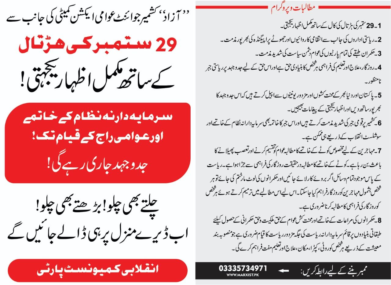 ہم سمجھتے ہیں کہ جوائنٹ عوامی ایکشن کمیٹی کی طرف دیے گئے چارٹر آف ڈیمانڈ میں زیادہ تر مطالبات بالکل جائز ہیں،اور کشمیری عوام کی امنگوں کے عین مطابق ہیں اور ہم ان کی مکمل حمایت کا اعلان کرتے ہیں اور ہم سمجھتے ہیں کہ جب تک ان مطالبات کو تسلیم کرتے ہوئے ان پر عمل نہیں کیا جاتا اس وقت تک یہ تحریک جاری رہنی چاہیے اور ہم پورے ملک میں اس کی حمایت کے لیے جدوجہد کریں گے۔